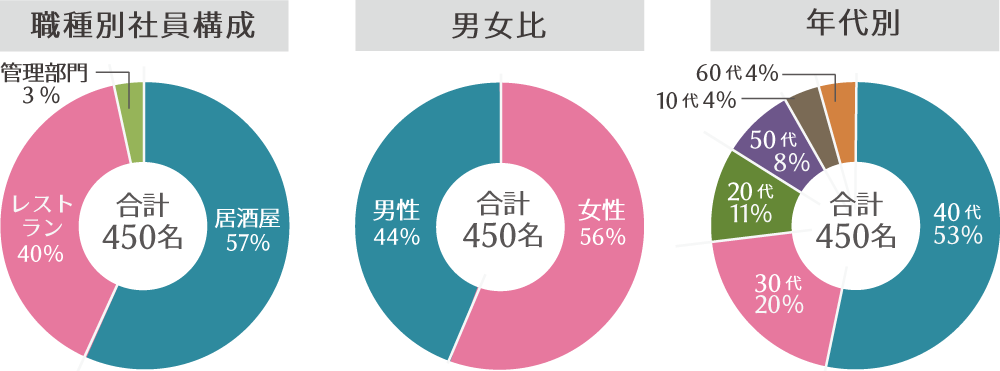 | 社員数 | 社員:約100名(グループ総数) パート・アルバイト:約400名(グループ総数) |